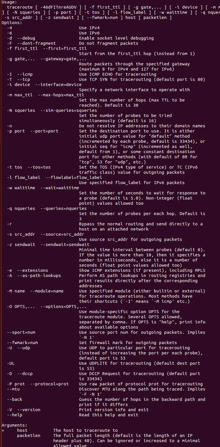 Usage: tracepath [-n] [-b] [-l <len>] [-p port] <destination>