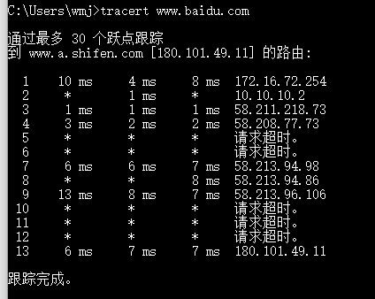 最左侧的1,2,3,4~13,表明在我是用的宽带上,经过12个(不算自己本地的)路由节点,可到达百度的服务。