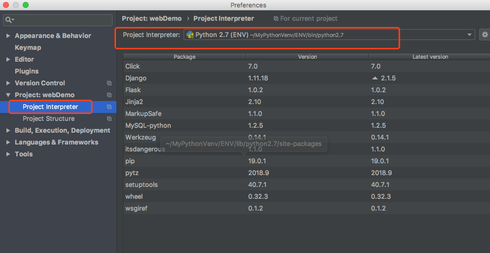 还好没放弃,楼主就想,肯定不能再这么玩了,再这么玩就没完没了了。心想:既然包我已经安装了,而且依赖也加进去了,是不是没有真正加载到项目里面呢,然后就去看了下pycharm对于环境的支持,发现卧槽。。。好像知道怎么回事了。接着查看了一下Project Interpreter那个方框里面的路径,到该路径下查看venv,发现site_pickage这里面根本就没有那些包。。。而python只会去你指定的虚拟环境下去找那个包。。。顿悟。。。