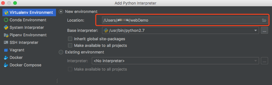后来又是一顿google,有说删掉project下的venv,这就有了最开始我的项目为什么没那个目录的原因(被我删了),反正各种。之后搜到好像这是pycharm的一个bug,本来应该在2018.1版本修复的,不知道为什么没修复。最后还是在那个existing environment里面通过搜索添加进去的(后来想想好像是哦,venv我已经创建好了,肯定是从existing里面找。。顿时觉得自己傻帽了),然后世界就豁然开朗了。。。终于不报错了。依赖包也完美的添加进去了。