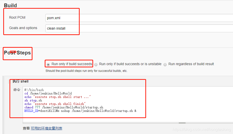 上面重点在于执行shell脚本,起始脚本看上去也是比较简单,stop.sh主要是停止当前的进程、startup.sh这个其实就是将jenkins生成的jar包拷贝到制定目录,然后java -jar运行而已。到这里页面上算是配置完成了,接下来看看上面三个shell脚本的内容