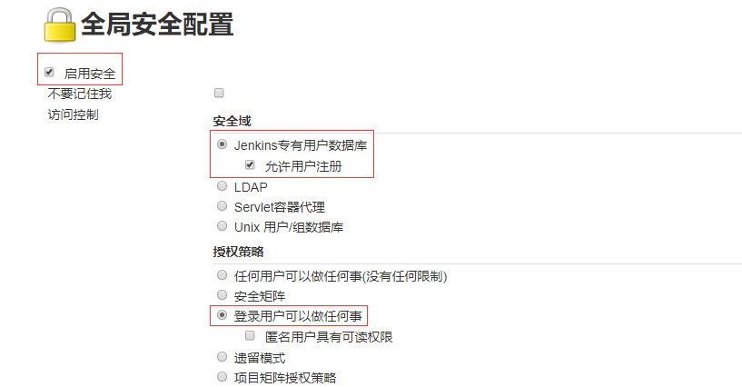 系统管理–>全局安全配置–>启用安全,勾选允许用户注册以及选择授权策略。