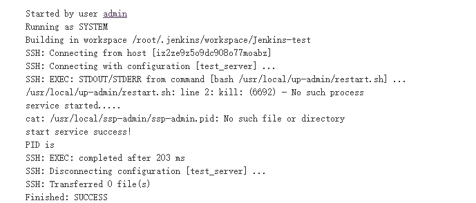 打好包的项目存放在 /root/.jenkins/workspace/Jenkins-test/up-admin/target/up-admin.jar