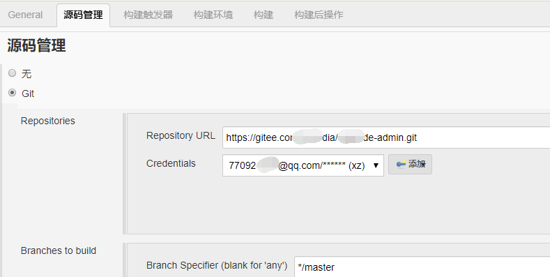 **Branch Specifier (blank for ‘any’)?*本地仓库分支名称,比如我这为master