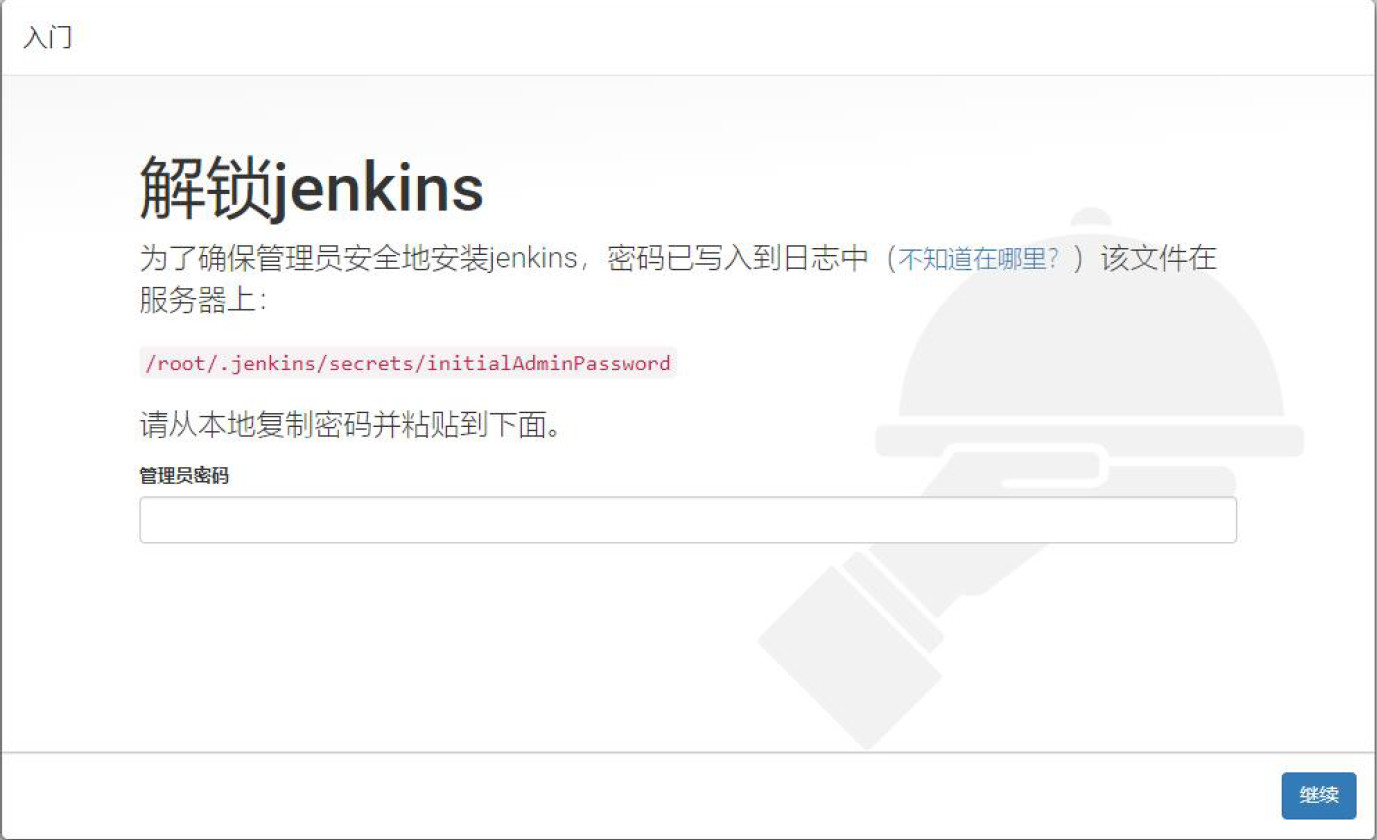 我们可以依照提示,在服务器上进入文件地址/root/.jenkins/secrets/initialAdminPassword下获取密码,填入如下文本框。