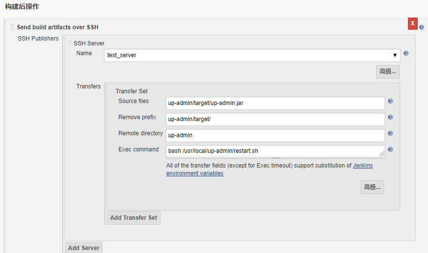 点击增加构建步骤,选择Send files or execute commands over SSH。当前设置的操作是构建完成后把打好的jar包放到目标路径下并执行远程shell脚本 bash /usr/local/up-admin/restart.sh。然后点击并保存。