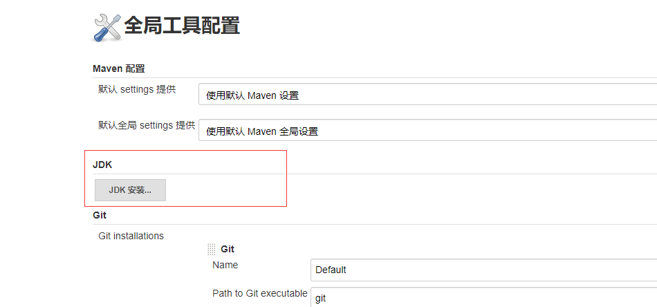 进入jenkins首页,新建任务之前,需要配置一下java环境,如果使用的git管理源码的话,git也需要配置一下,配置如下