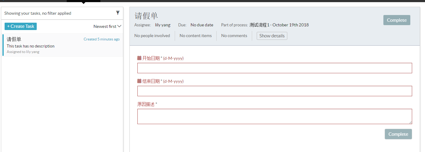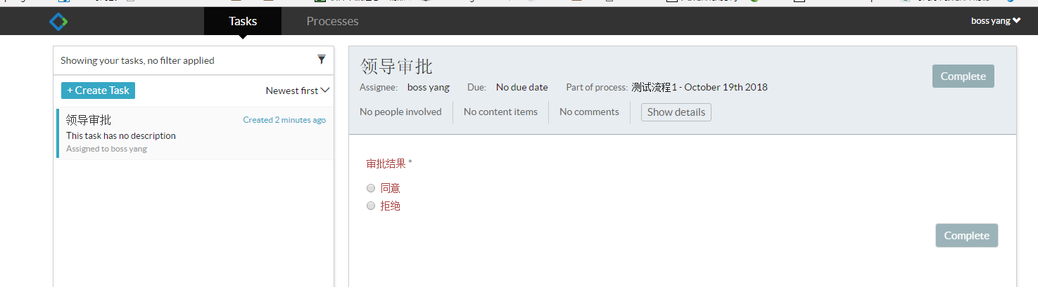 填写完成后,点击complete,可以看到流程走到boss用户了