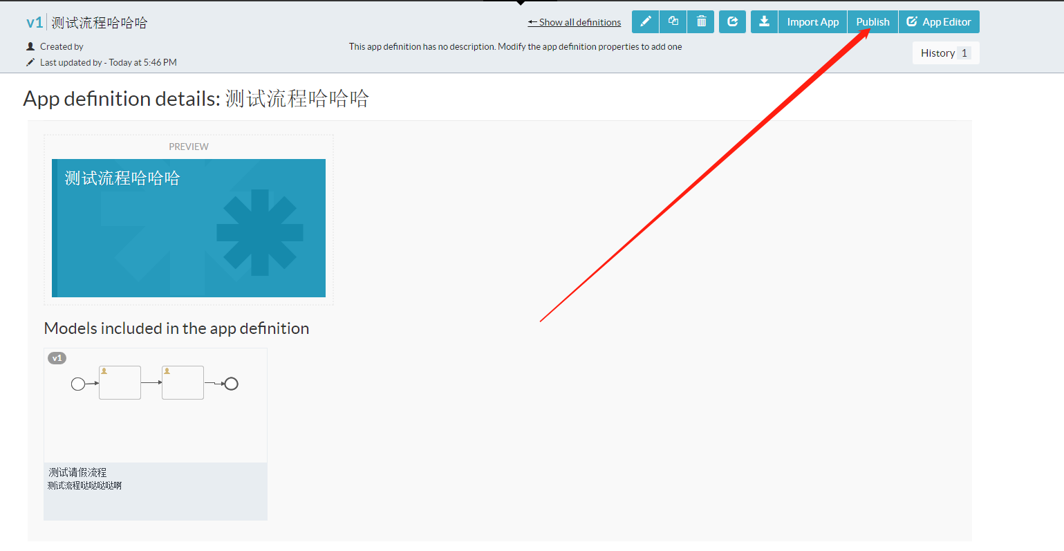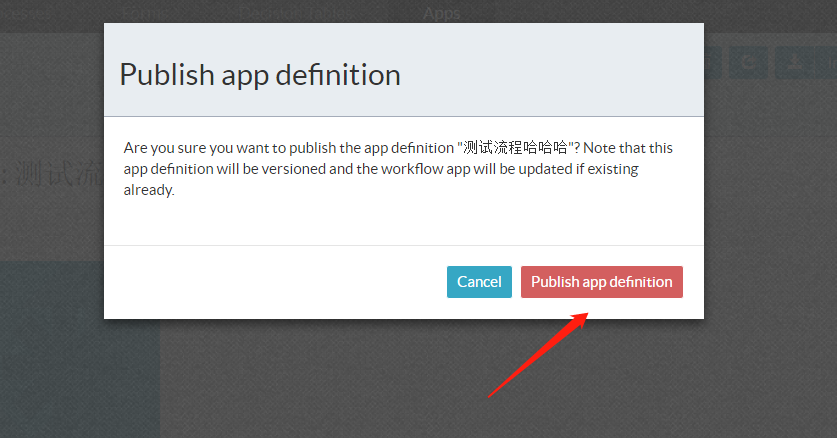 选择刚刚创建的这个app,点击进入,然后点击右上角的publish按钮,即可将该流程进行发布