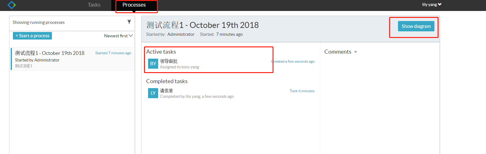 此时自定义的流程已经启动完毕了,接着需要分别用lily和boss两个用户登录系统,进行相应的任务处理