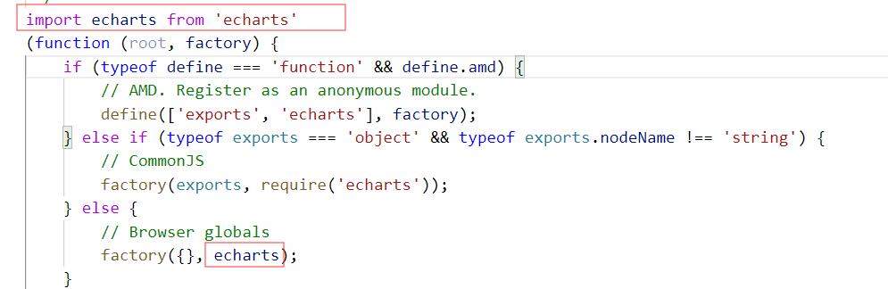 把 js文件里的root.echarts 改成echarts;然后在该js文件内 import echarts from 'echarts'
