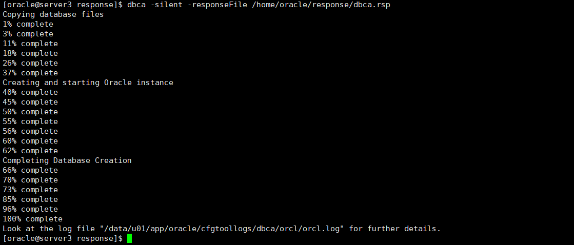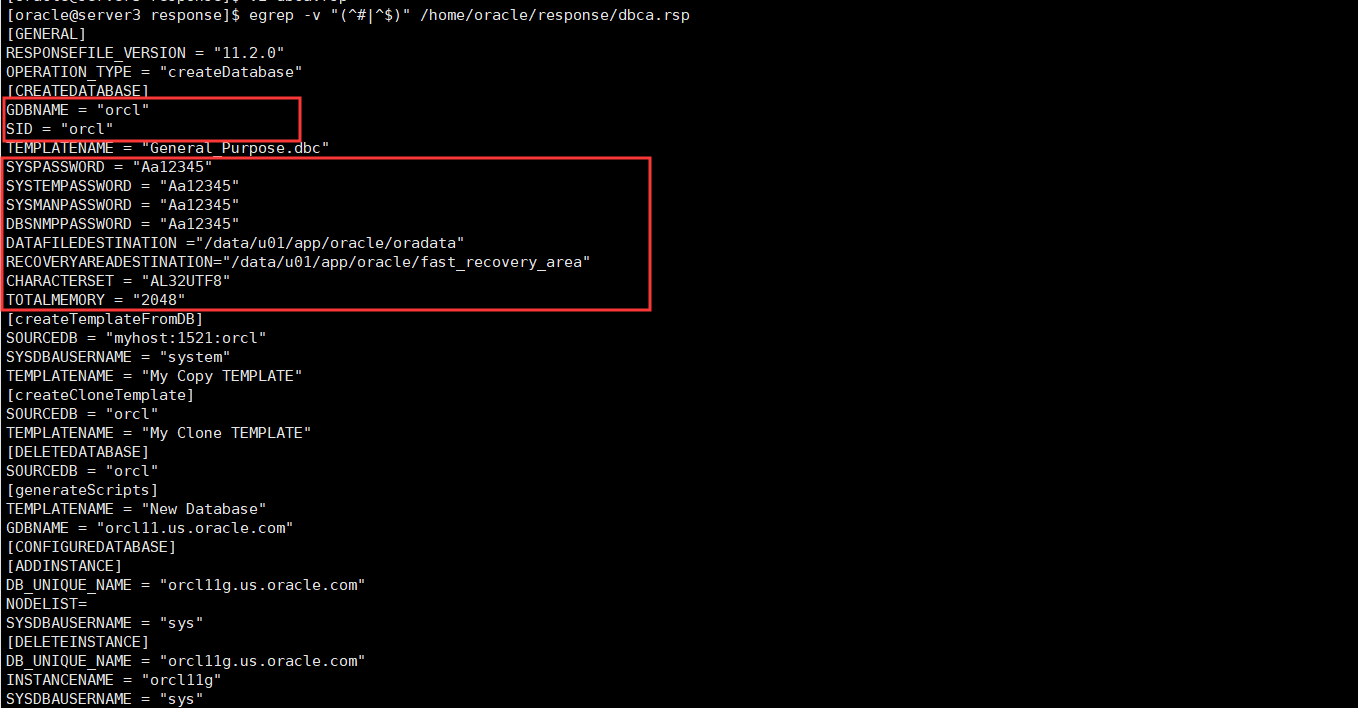 修改静默安装响应文件/home/oracle/response/dbca.rsp,修改完成后可以预览检查下配置情况: