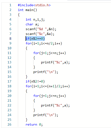 输入在一行中给出正方形边长N(3≤N≤21)和组成正方形边的某种字符C,间隔一个空格。