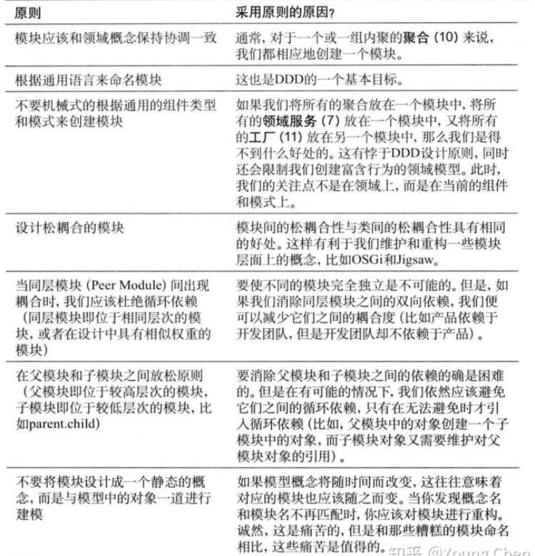 DDD中模型中的模块表示一个命名的容器,用于存放领域中内聚在一起的类,将类放在不同模块中目的在于松耦合。模块是通用语言的重要组成部分。设计模块的一些原则: