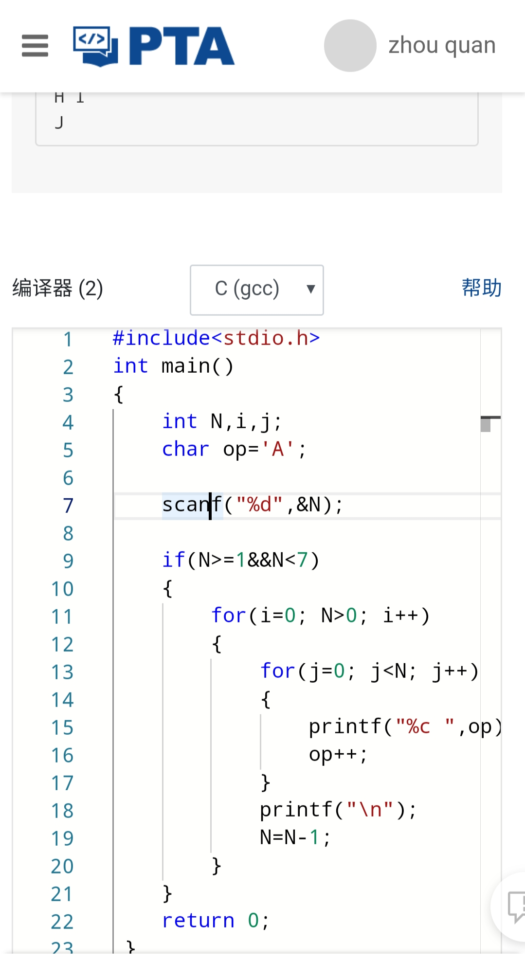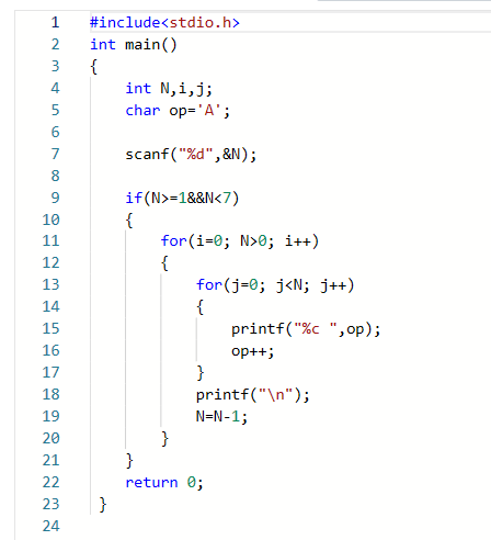 输出n行由大写字母A开始构成的三角形字符阵列。格式见输出样例,其中每个字母后面都有一个空格。