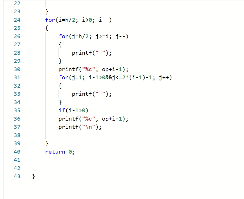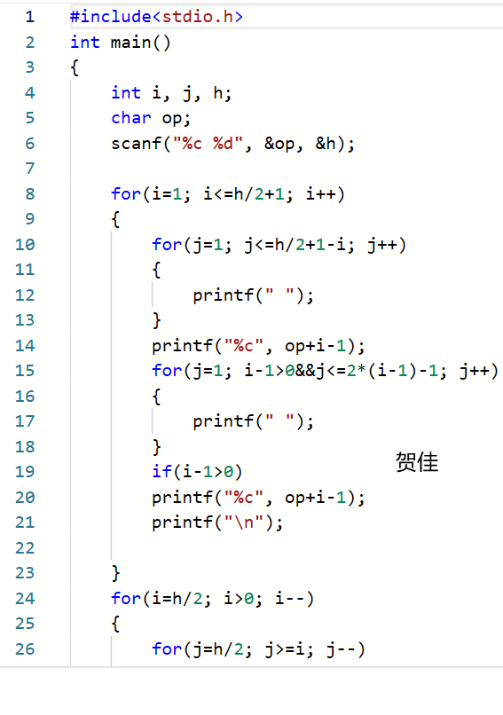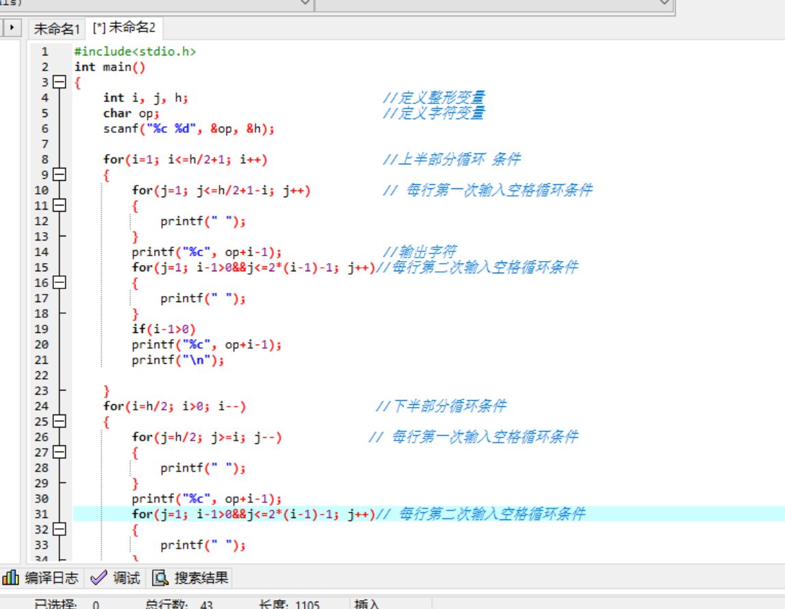 数据表达:本题使用整形变量i,j,h,字符变量op;其中h和op通过输入得到,i和j通过赋值的得到;