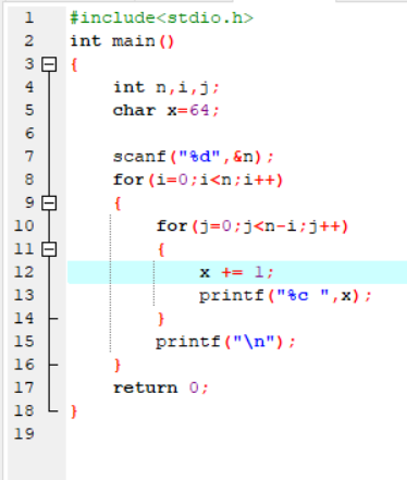 数据表达:设置了n,j,i为整型,x为字符型,n为输入的行,i为行,j为列,x代表'a'设置为64