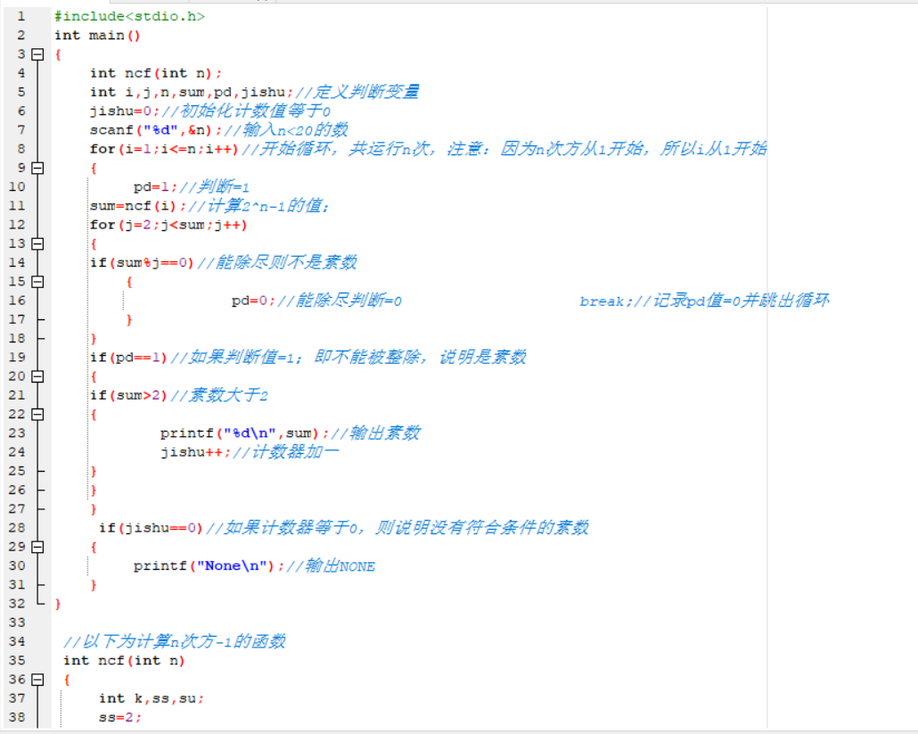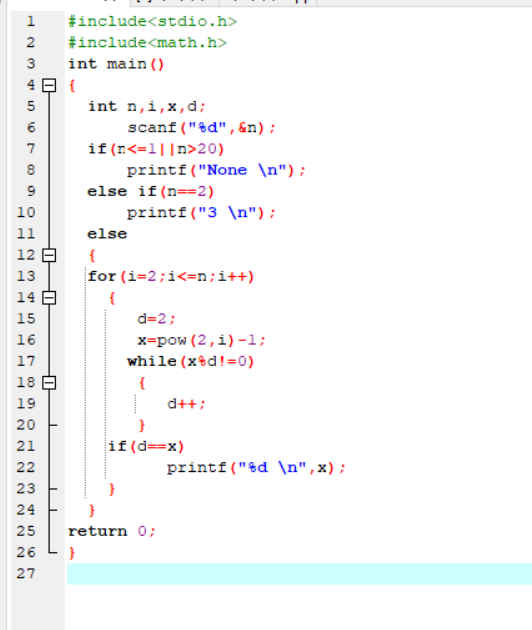数据表达:设置了n,x,i,d整型变量,n为输入正整数,i为for运算数据,d用与判断是否有素数,x为2的i次方减一值