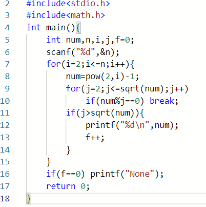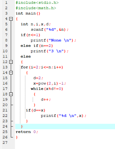−1的梅森数,每行一个。如果完全没有,则输出“None”。