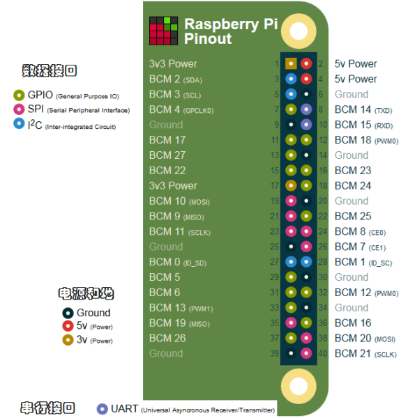 电源和接地引脚用于外部电路供电。所有版本标准40针 GPIO版本的树莓派都有两个5V引脚和两个3.3V引脚,而且均在同一个物理位置。除了5V和3.3V引脚外,它们还有8个接地引脚。电源和接地脚可以让你的树莓派为一些外部元件供电,如LED。需要注意的是,通过这些引脚为任何外部模块或元器件供电之前,应该保持谨慎,过大的工作电流或峰值电压均有可能损坏树莓派。