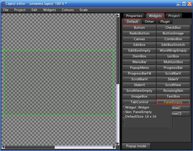 这里使用Layout editor来完成UI的框架搭建。Widgets->Window创建UI布局的窗口。不同于教程文档中的是,这里建立开发者在设计UI界面初期,建议使用PanelEmpty作为背景,如图7-1-1所示,因为其只起到界面范围约束的作用。