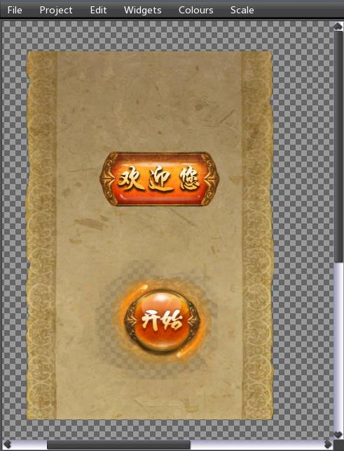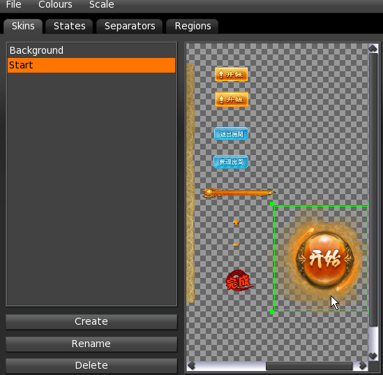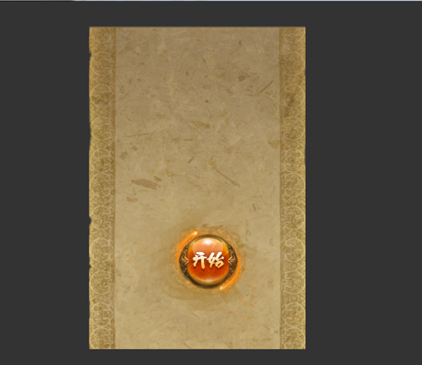(20)添加皮肤完成后点击File——>Save进行保存。然后将更新后的start.layout替换UIMedia目录下原来的start.layout文件,重新在Genesis中发布并运行UI项目,结果如下。漂亮的背景图片上出现了”开始“: