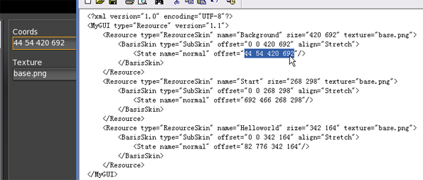 (13)用记事本打开skin.xml,按照左侧SkinEditor中的Coords栏中的数值依次修改三个皮肤的offset值: