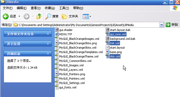 (12)打开…\GenesisProjects\UI\Asset\UIMedia目录,进行以下三个步骤:修改skin.xml,创建Init.xml,修改gui_core.xml: