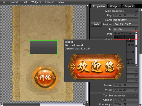 (19)我们依次为backgroundButton添加皮肤Background,为startButton添加皮肤Start,helloButton添加皮肤Helloworld。全部添加完成后效果如下: