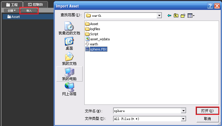 1.导入fbx文件。点击工程面板的“导入”按钮会弹出如下对话框,找到sphere.fbx文件,点击打开。