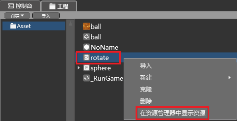 点击“在资源管理器中显示资源”后,在创建的脚本历我们要添加代码以实现控制球体转动。步骤如下图所示: