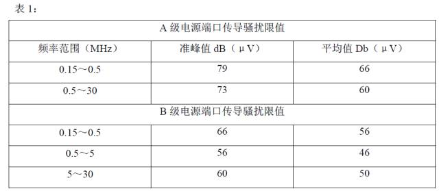 开关电源的传导骚扰是通过电源的输入电源线向外传播的电磁干扰。在开关电源输入电源线中向外传播的骚扰,既有差模骚扰、又有共模骚扰,共模骚扰比差模骚扰产生更强的辐射骚扰。传导骚扰的测试频率范围为150KHz~30MHz,限值要求如下表1 所示: