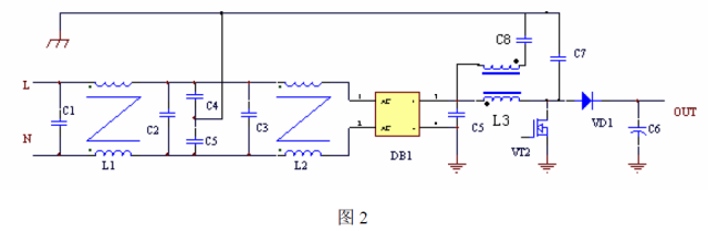 在0.15MHz~1MHz 的频率范围内,骚扰主要以共模的形式存在,在1MHz~10MHz 的频率范围内,骚扰的形式是差模和共模共存,在10MHz 以上,骚扰的形式主要以共膜为主。传导发射的差模骚扰的产生主要是由于开关管工作在开关状态,当开关管开通时,流过电源线的电流线形上升,开关管关断时电流突变为0,因此流过电源线的电流为高频的三角脉动电流,含有丰富的高频谐波分量,随着频率的升高,该谐波分量的幅度越来越小,因此差模骚扰随频率的升高而降低,另外,如下图1 所示,由于电容C5 的存在,它与电感L3 组成低通滤波器,因此,差模传导骚扰主要存在低频率段。
