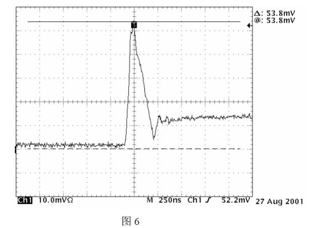 图7 中,TI 是变压器,VD1、VD2 分别是整流管和续流管,由于整流管、续流管在由导通转向截止时有反向恢复电流,该反向恢复电流在VD1、VD2 两端产生比较高的电压峰值,由于快恢复二极管的反向恢复电流在几十nS,所以峰值电压的频率较高,其基波频率在几十MHz,由于频率很高,辐射能力很强,下图8 是整流管和续流管的电压波形。