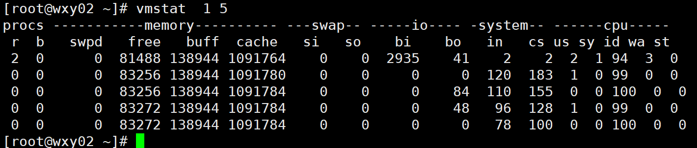 vmstat 1 5(1表示间隔时间为1秒,5表示运行次数)