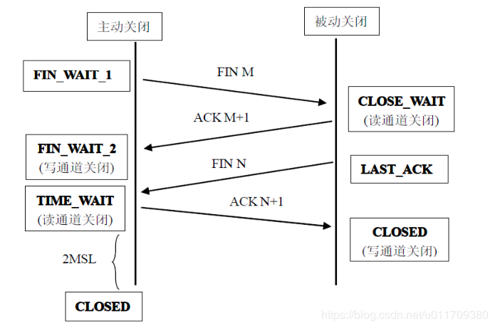 数据传输完毕后,双方都可释放连接。最开始的时候,客户端和服务器都是处于ESTABLISHED状态,假设客户端主动关闭,服务器被动关闭。