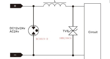 TVS主要用在电源输入端起到防浪涌的作用,瞬间吸收浪涌电流对后级电路起到保护作用。ESD二极管的正负接在电源引脚,公共端接在被保护引脚上起到释放静电的作用。如下图所示。