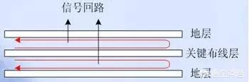 1.关键布线层(时钟线、总线、接口信号线、射频线、复位信号线、片选信号线以及各种控制信号线等所在层)应与完整地平面相邻,优选两地平面之间,如图1所示。关键信号线一般都是强辐射或极其敏感的信号线,靠近地平面布线能够使其信号回路面积减小,减小其辐射强度或提高抗干扰能力。