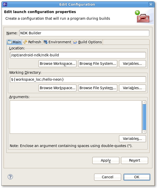 - /opt/android-ndk/ndk-build (or wherever your ndk-build binary is). You may use a variable as in ${system_property:user.home}/lib/android-ndk/ndk-build