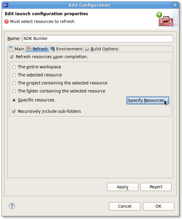 Now continue with the refresh tab. Make sure the two checkboxes Refresh resources upon completion. and Recursively include sub-folders are checked. Choose the Specific resources radio button and press the Specify Resources... button:
