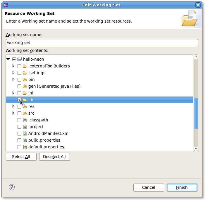 Since the ndk-build process will generate files in the lib folder, we want Eclipse to discover changes made there without having to refresh manually. So select the lib folder in the project (create one if necessary) and press the Finish button: