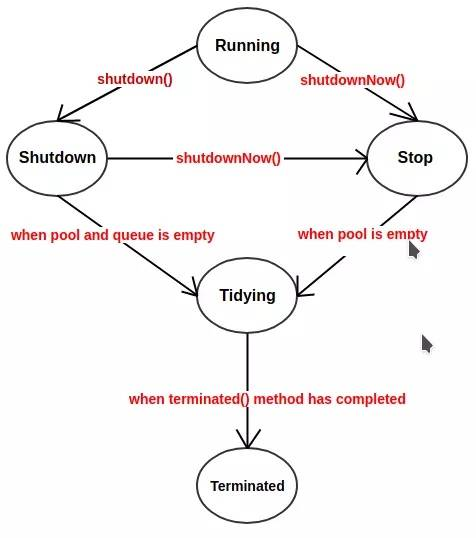 - STOP 停止状态,不会接受新任务,也不处理队列中的任务,直接中断