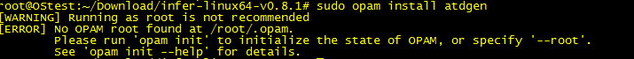 根据其中的提示,我们可以使用opam安装缺少的插件。运行:sudo opam install atdgen ,若是当前opam环境没有配置好,我们需要先配置opam环境。