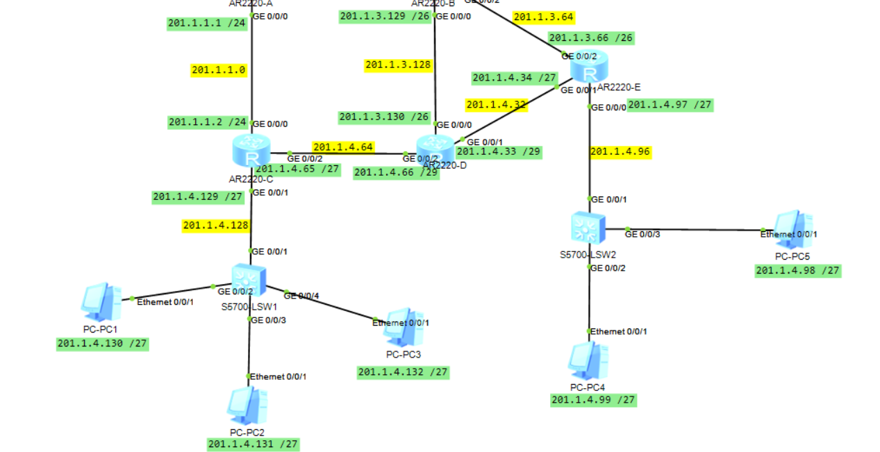 由于本次实验在模拟器上进行,RIP2实验结束时将每个路由器都执行了save命令,本次实验继续使用之前的topo文件,可以保证整个网络是来联通的,多余的主机ping路由器等截图不再列出。