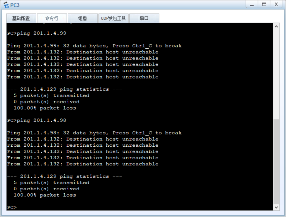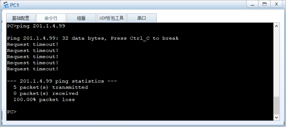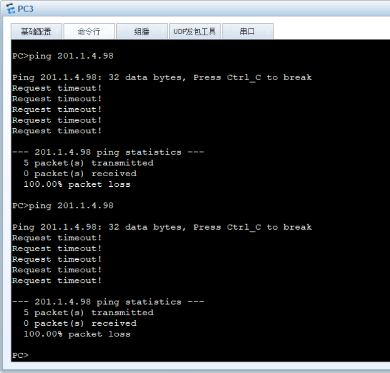 在基本访问控制列表实验中,我们设置了禁止特定主机PC3访问PC5所在网络内的主机。访问控制列表设置完成后,主机7-3自然无法ping通主机7-5。
