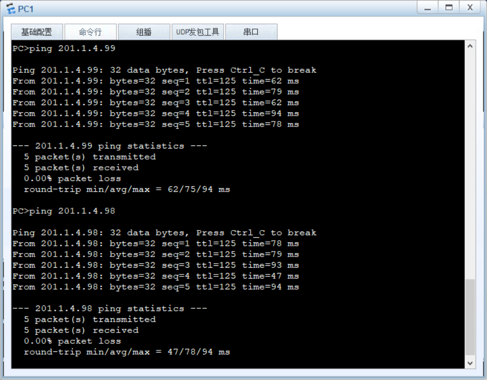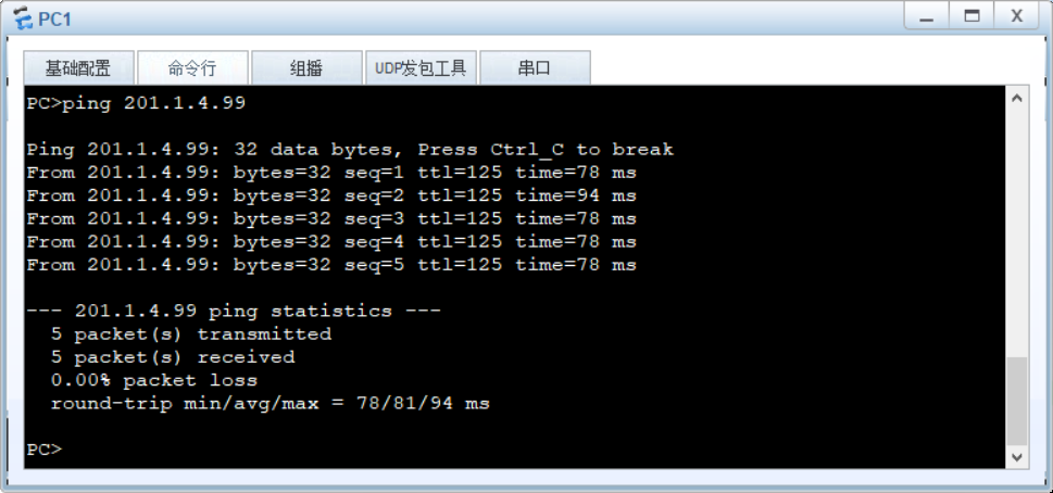 图表 37设置完成后主机7-1能ping通主机7-4和主机7-5,说明反子网掩码计算正确