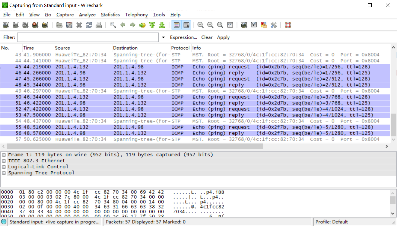- 结合局部拓扑以及两个数据抓包结果,可以看到正常情况下ping命令执行时源地址发送一个request数据包,目的地址会返回一个reply数据包。