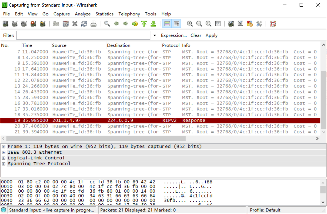图表 11实验前对拓扑图中红线进行数据抓包,此图为Ee1