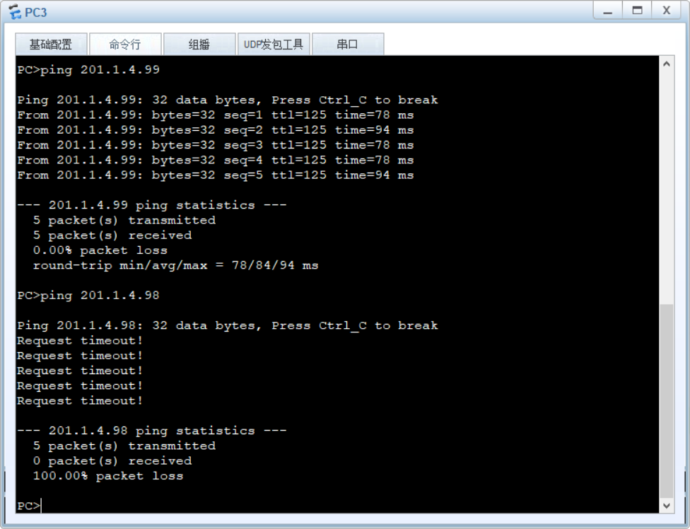 图表 36设置完成后主机7-3能ping通主机7-4却无法ping通主机7-5,说明操作成功