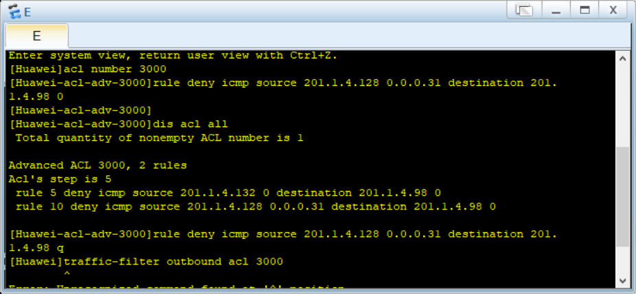 说明:在进行该实验前,本小组将模拟器进行了重启,重启之前没有执行save命令,因此之前实验的访问控制列表已经不在,不需要执行undo操作。
